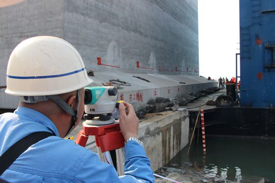 首件沉箱的安裝,事先要在把安裝位置坐標(biāo)計算出來,并對安裝點的基槽進行開挖清淤,形成平整的基床。沉箱拖運到安裝點附近后,待潮水處于低位后,通過GPS系統(tǒng)精確定位,把沉箱移至預(yù)定的安裝位置上,然后打開沉箱的進水閥門,對沉箱內(nèi)進行灌水。當(dāng)沉箱內(nèi)各隔倉灌水基本平衡,至沉箱底板離基床面距離為1m時,關(guān)閉各個進水閥門,使用沉箱上掛的水泵對沉箱四角進行調(diào)平,再通過GPS來測量控制進行沉箱精準(zhǔn)安裝。沉箱著落基床誤差不能超過5cm,工程技術(shù)含量高、操作難度大。為此,項目部投入大量人力、物力,精心籌劃,齊心協(xié)力攻克了施工難點,為首件沉箱安裝成功奠定了堅實基礎(chǔ)。 |