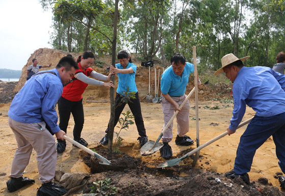 由于連日多雨天氣,植樹現場土地泥濘,但絲毫不影響集團員工的勞動熱情。大家扶苗、揮鏟、培土,現場一派熱火朝天的景象。短短一個小時,數十棵樹苗迎風挺立,扎根在這曾為茂名工業(yè)發(fā)展做出巨大貢獻的土地上,把露天礦生態(tài)公園裝點得更加生機盎然。