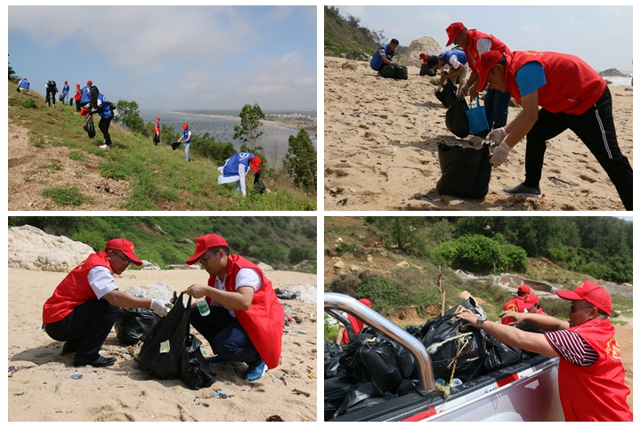 到達(dá)目的地,志愿者們被海天一色的美麗景觀所吸引,只見(jiàn)遠(yuǎn)處灣內(nèi)漁船首尾相銜,身旁細(xì)軟的沙灘上游人如織,四處一派歡樂(lè),然而岸邊零星散落的垃圾廢物卻破壞了和美的畫(huà)面。志愿者們下車后立刻展開(kāi)清潔行動(dòng),各自提著垃圾袋,俯身拾起各類塑料、瓶罐、煙頭等垃圾。游客們對(duì)集團(tuán)黨員志愿者和團(tuán)員青年志愿者們的行動(dòng)交口稱贊,并主動(dòng)加入清潔行列。經(jīng)過(guò)半天的努力,景區(qū)里目所能及的垃圾大為減少,捆扎好的垃圾填滿了皮卡車的尾兜,并被志愿者們拉去附近垃圾站進(jìn)行處理。