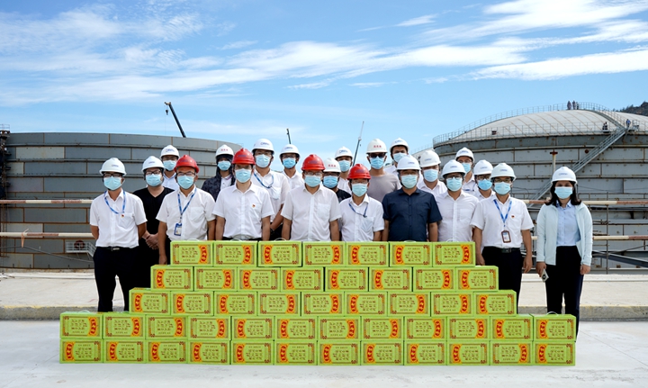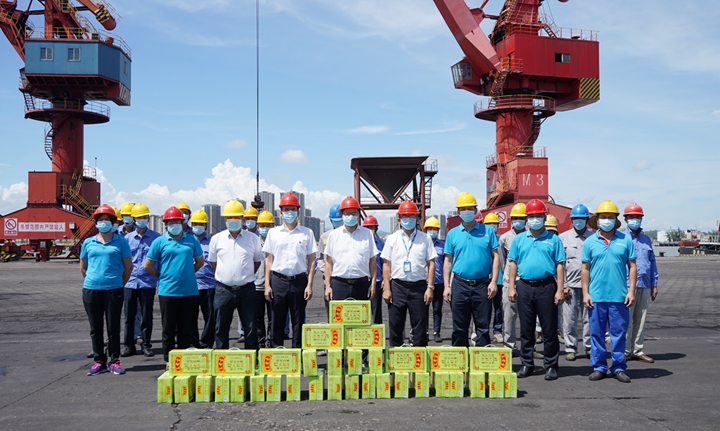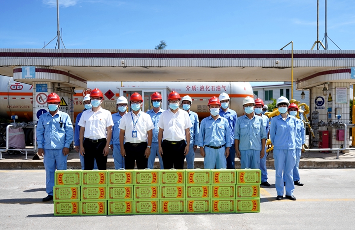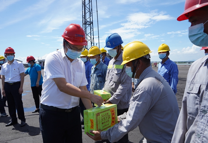 7月14日,集團黨委委員、副總裁、工會主席楊超燦率隊到集團下屬港口經(jīng)營公司碼頭作業(yè)現(xiàn)場、中油王港公司庫區(qū)、博賀新港區(qū)重點項目施工現(xiàn)場等處“送清涼”,為奮戰(zhàn)一線的職工發(fā)放防暑降溫飲品、用品。